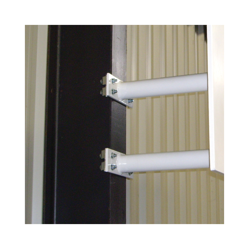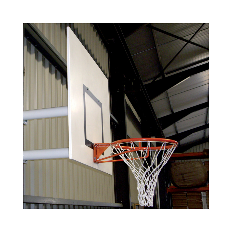 But de basket mural fixe réalisé en tube acier plastifié blanc et muni d’un panneau rectangulaire (1200x900x20mm.) , d’un cercle renforcé et d’un filet de maille Ø5mm. Déport de 0,60m. 8 fixations murales. Hauteur fixe. Très solide et d’une excellente résistance.