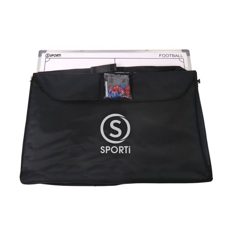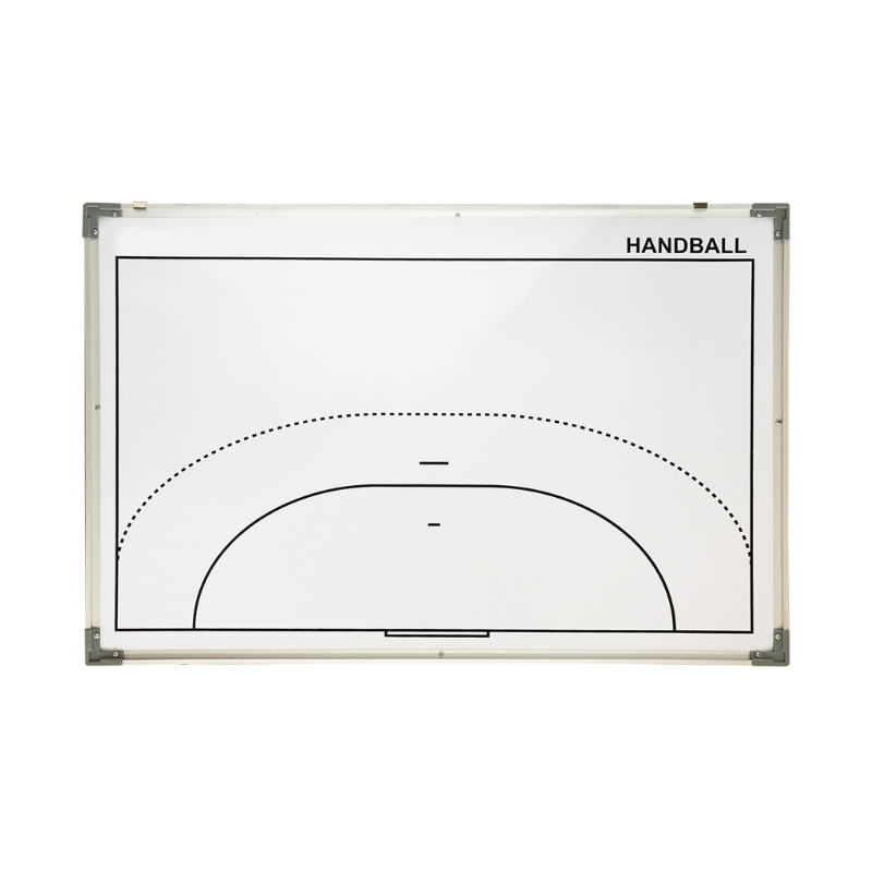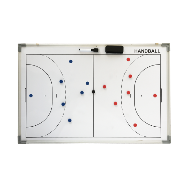 Tableau tactique rigide, avec d’un côté un terrain de handball entier et de l’autre un 1/2 terrain. Livré avec sa housse de transport, ses aimants (7 bleus, 7 rouges et 1 noir), une brosse, un feutre et un sachet.*