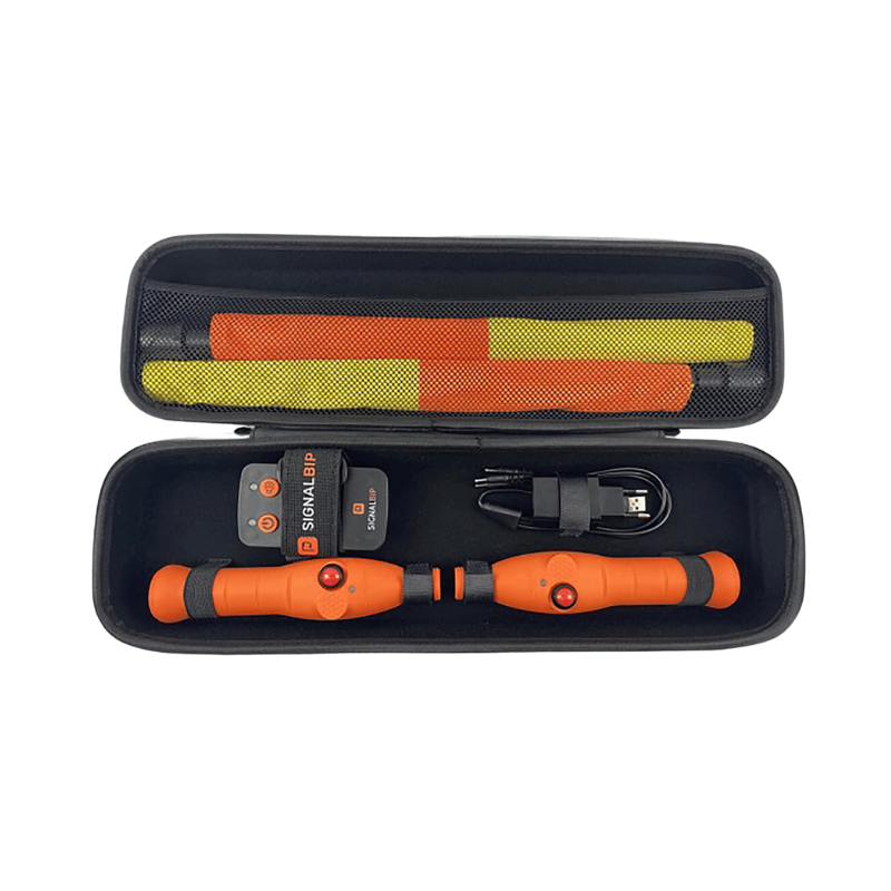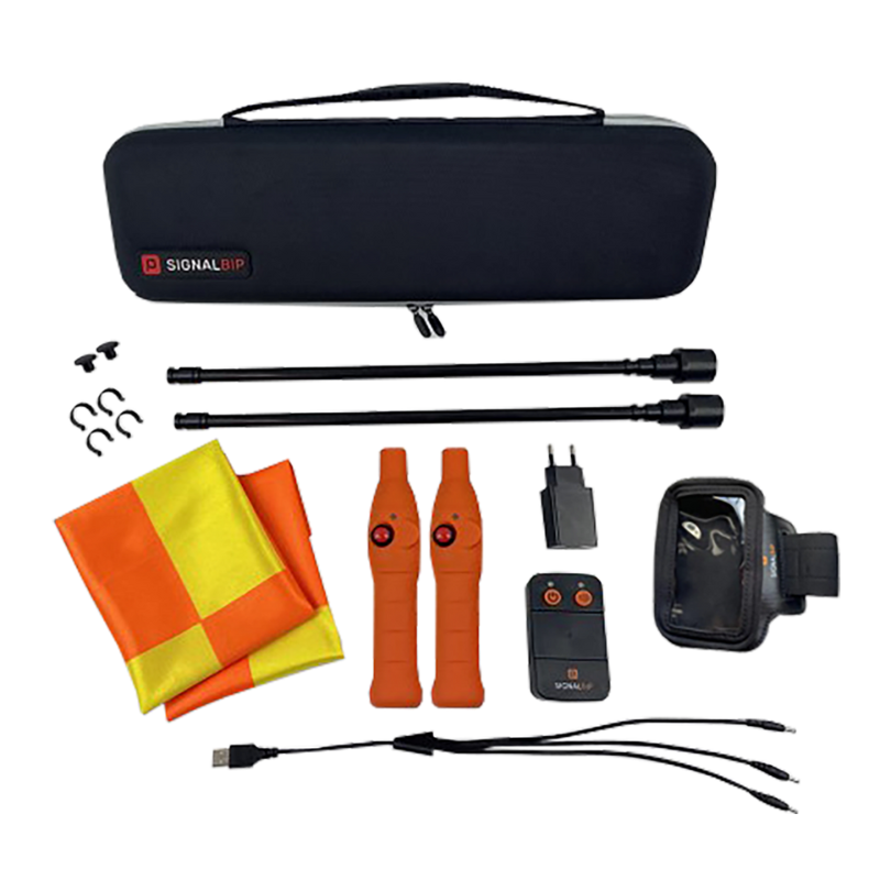 Transmission radio longue portée. Autonomie de 20 heures. Réglage du volume et du vibreur sur le boitier brassard en 5 niveaux + mode OFF. Mise en veille automatique du drapeau. Vibreur et buzzer intégrés sur les drapeaux. Chargeur fourni avec adaptateur USB de 3 connecteurs pour rechargement simultané des drapeaux et du boitier brassard.
