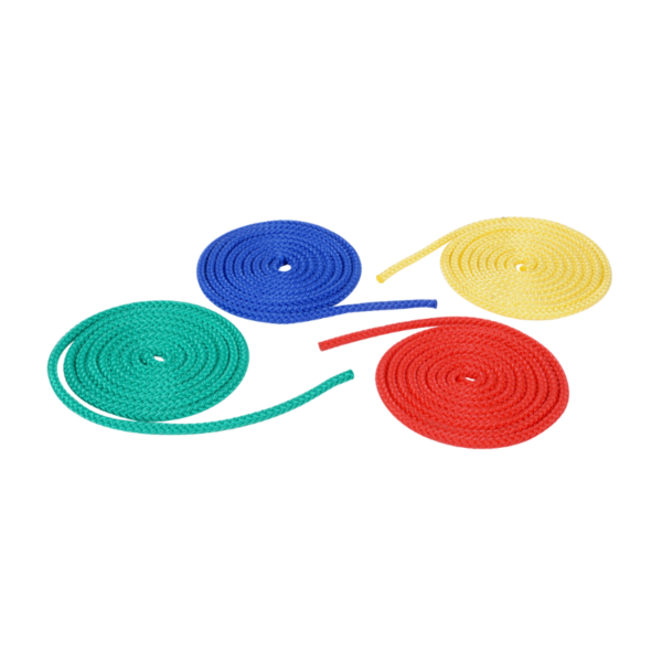 Lot de 4 cordes à sauter d'initiation (1 rouge, 1 bleue, 1 jaune, 1 verte) en nylon de diamètre 8mm et de longueur 3m.