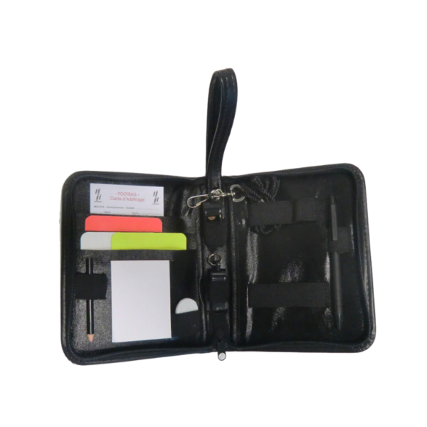 Sacoche d’arbitre comprenant : – 1 carton rouge – 1 carton jaune – 1 carton blanc – 1 carnet de 15 feuilles arbitrage foot – 1 bloc neutre – 1 sifflet avec cordon – 1 sifflet seul – 1 jetons à 2 faces – 1 crayon à papier – 1 stylo à bille, le tout dans une sacoche avec plusieurs compartiments et une fermeture éclair.