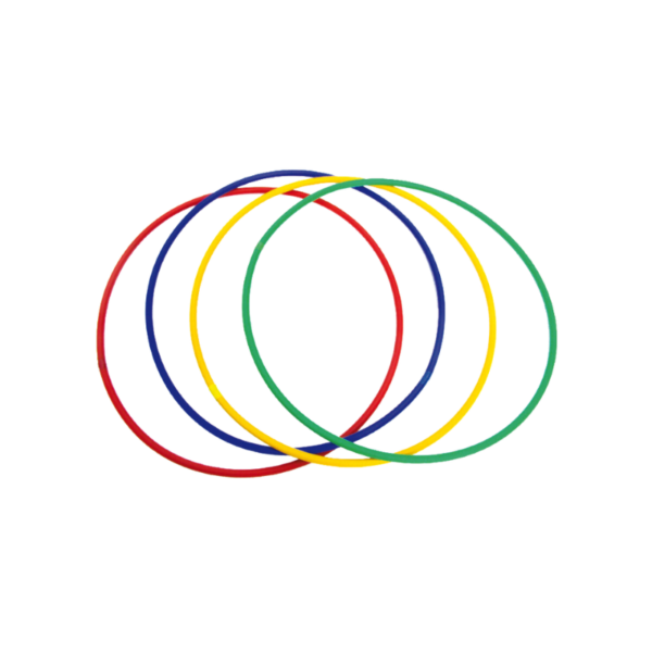 Set de 4 cerceaux lestés, Ø72cm. de 4 couleurs différentes. Les cerceaux tiennent verticalement debout dans le fond de la piscine.